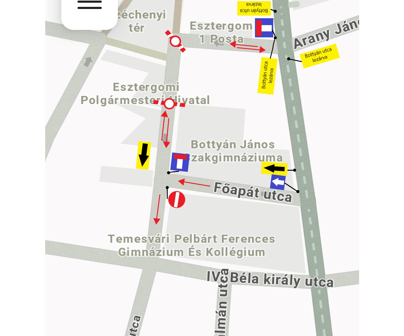 Tájékoztatjuk a Tisztelt Lakosságot, hogy 2025. június 04-én 8:00 órától 16:00 óráig, a Bottyán utca, Arany János utca és Főapát utca közötti szakasza a Polgármesteri Hivatal felújításához kapcsolódó daruzási munkák miatt ideiglenesen lezárásra kerül.