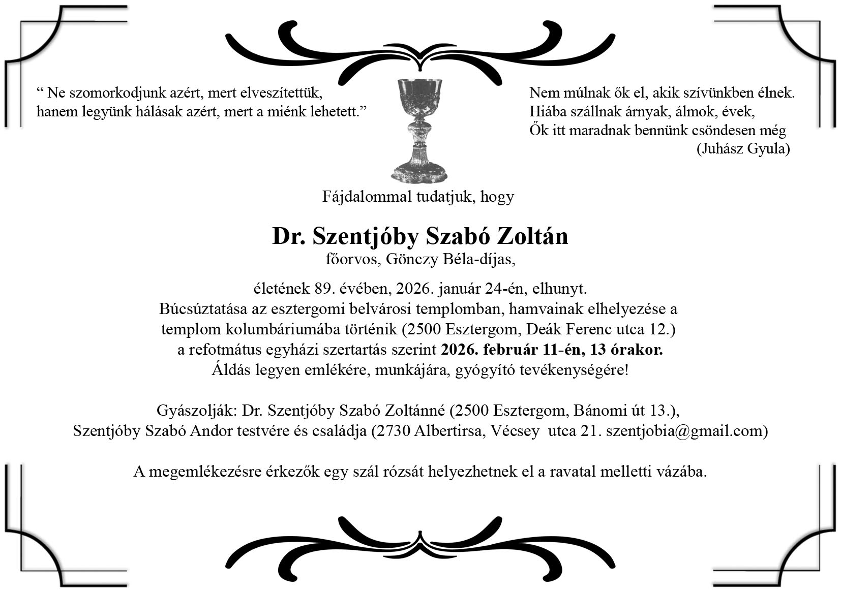 Mindazok, akik szeretnének végső tiszteletüket leróni és megemlékezni munkásságáról, hivatásának örökségéről, ezen az alkalmon búcsúzhatnak el tőle.