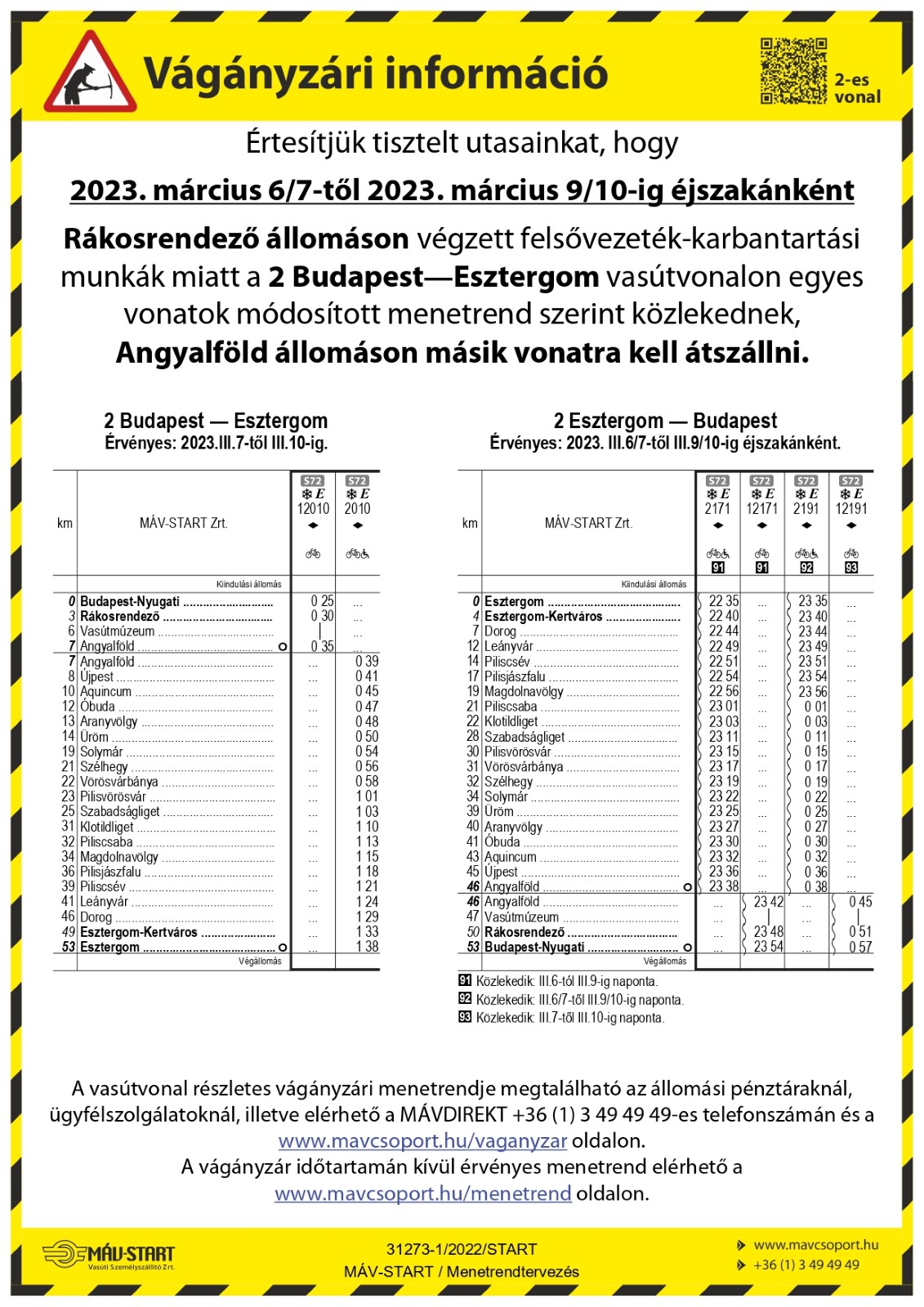 A MÁV-START Zrt. tájékoztatta az Igazgatóságot, hogy 2023. március 6/7-től 2023. március 9/10-ig éjszakánként Rákosrendező állomáson végzett felsővezeték-karbantartási munkák miatt a 2 sz. Budapest—Esztergom vasútvonalon a hirdetményben szereplő vonatok módosított menetrend szerint közlekednek, Angyalföld állomáson másik vonatra kell átszállni.