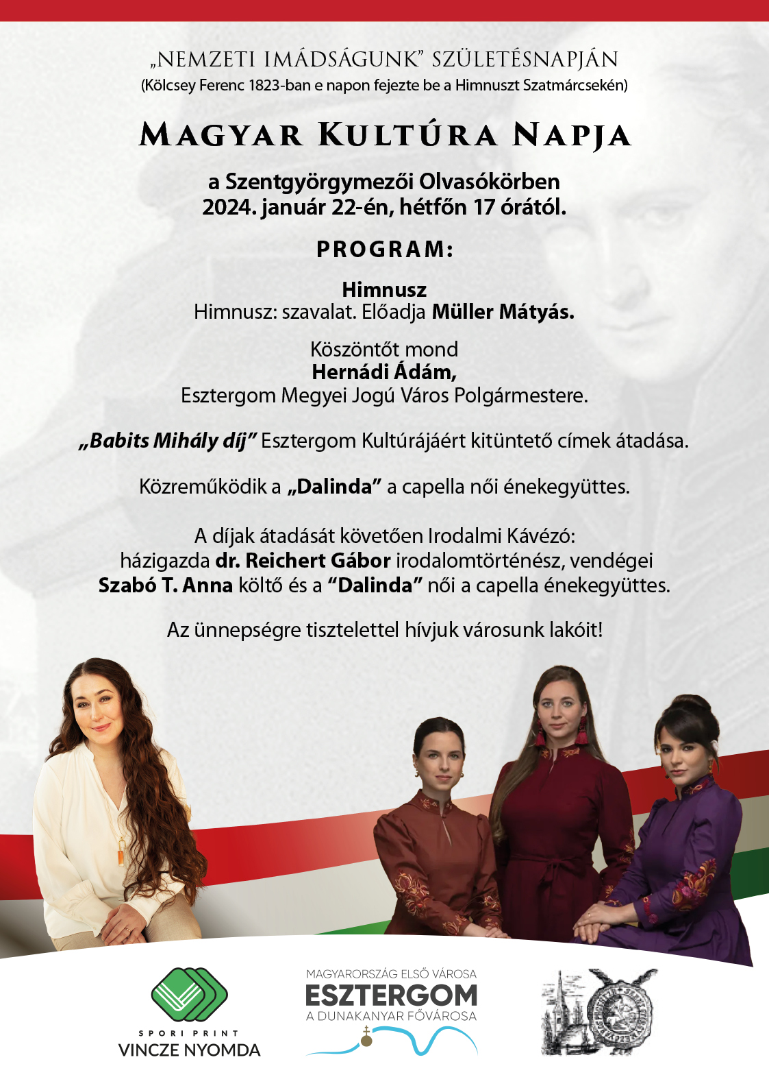 201 éve, 1823 január 22-én fejezte be Kölcsey Ferenc a Hymnus, a' Magyar nép zivataros századaiból című versét. Ennek apropóján 1989 óta ezen a napon ünnepeljük a magyar kultúra napját. A kéziratról sokáig azt hitték, elveszett, ám 80 éve, 1944-ben megégve, de szövegében szinte teljesen végül előkerült. A magyar kultúra napján számos renezvénnyel, programmal emlékeznek meg Kölcsey - a magyarság számára mai napig legmeghatározóbb - alkotásáról. Nincs ez másképp Esztergomban sem, ahol idén a Szentgyörgymezői Olvasókör szervezésében ünnepelhetünk.