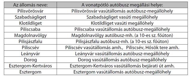 A vonatpótló autóbuszok megállási helyei állomásonként: