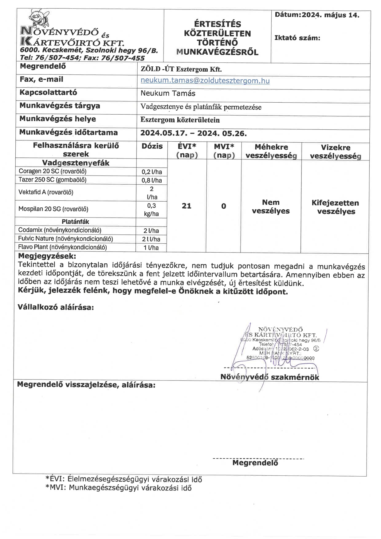 Ezúton is értesítjük a tisztelt lakosságot, hogy a Zöld-Út Esztergom Kft. ismételten növényvédelmi kezelést (vadgesztenye és platánfák permetezése) végez Esztergom Megyei Jogú Város közterületein.