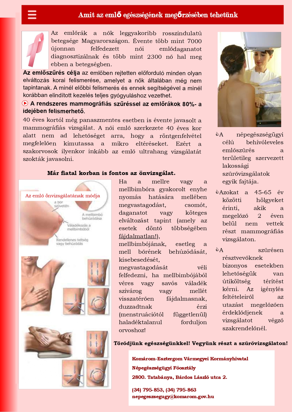 A Népegészségügyi Program keretében zajló, két évenként esedékes mammográfiás szűrővizsgálattal kapcsolatosan tájékoztatom, hogy Esztergom település vonatkozásában, a 45 - 65 éves korosztályba tartozó hölgy lakosok szűrővizsgálata tovább folytatódik. Az érintett hölgyek szűrésre invitáló levelet kapnak a MammAlba Kft. (székhely: Székesfehérvár, Virág B. út 5.I/1.) mozgó Emlőszűrő Állomásától, a Szent Borbála Kórházzal kötött megállapodásuk alapján.