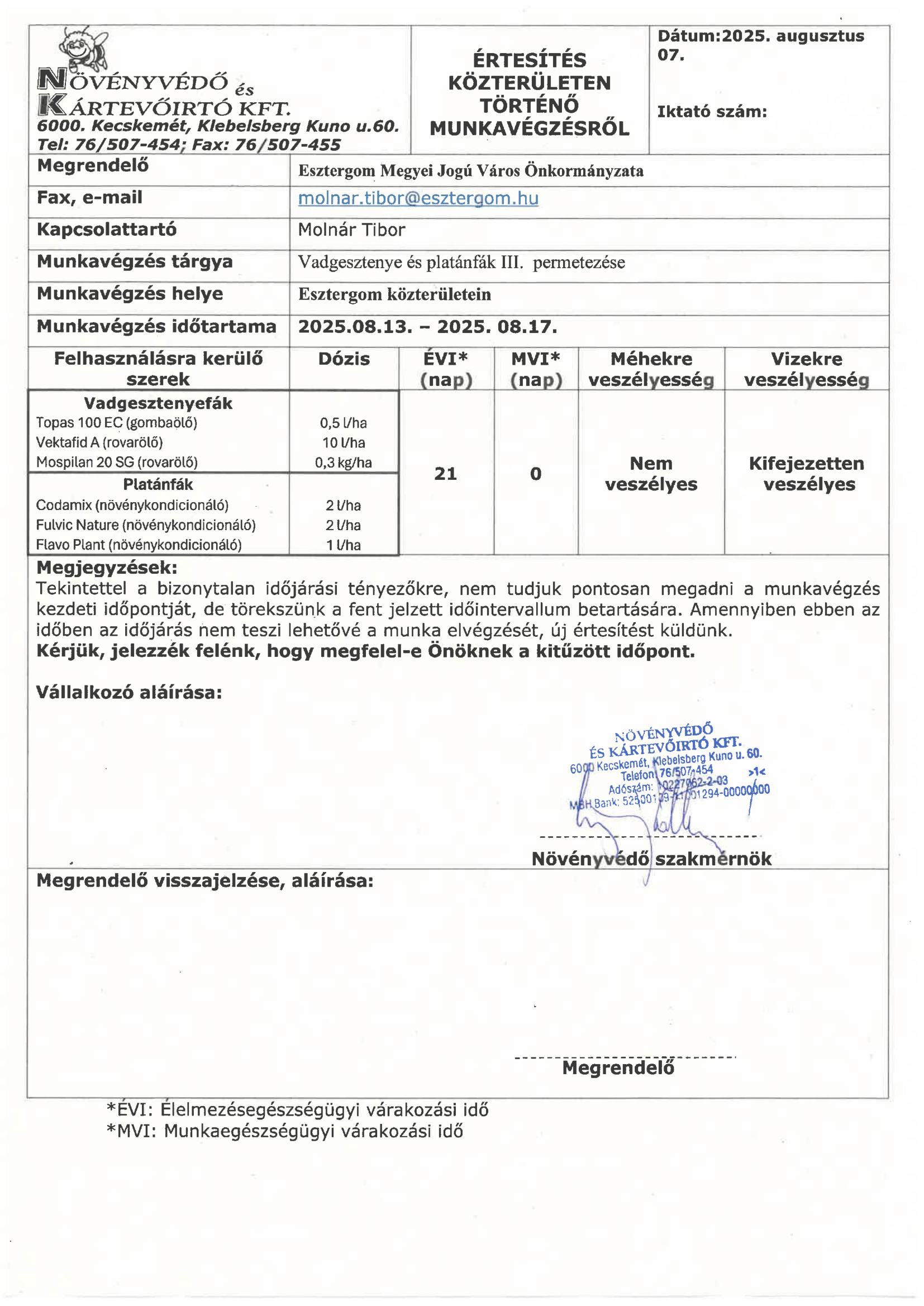 Ezúton is értesítjük a tisztelt lakosságot, hogy ismételten növényvédelmi kezelést (vadgesztenye és platánfák permetezése 3.ütem) végeznek Esztergom Megyei Jogú Város közterületein.