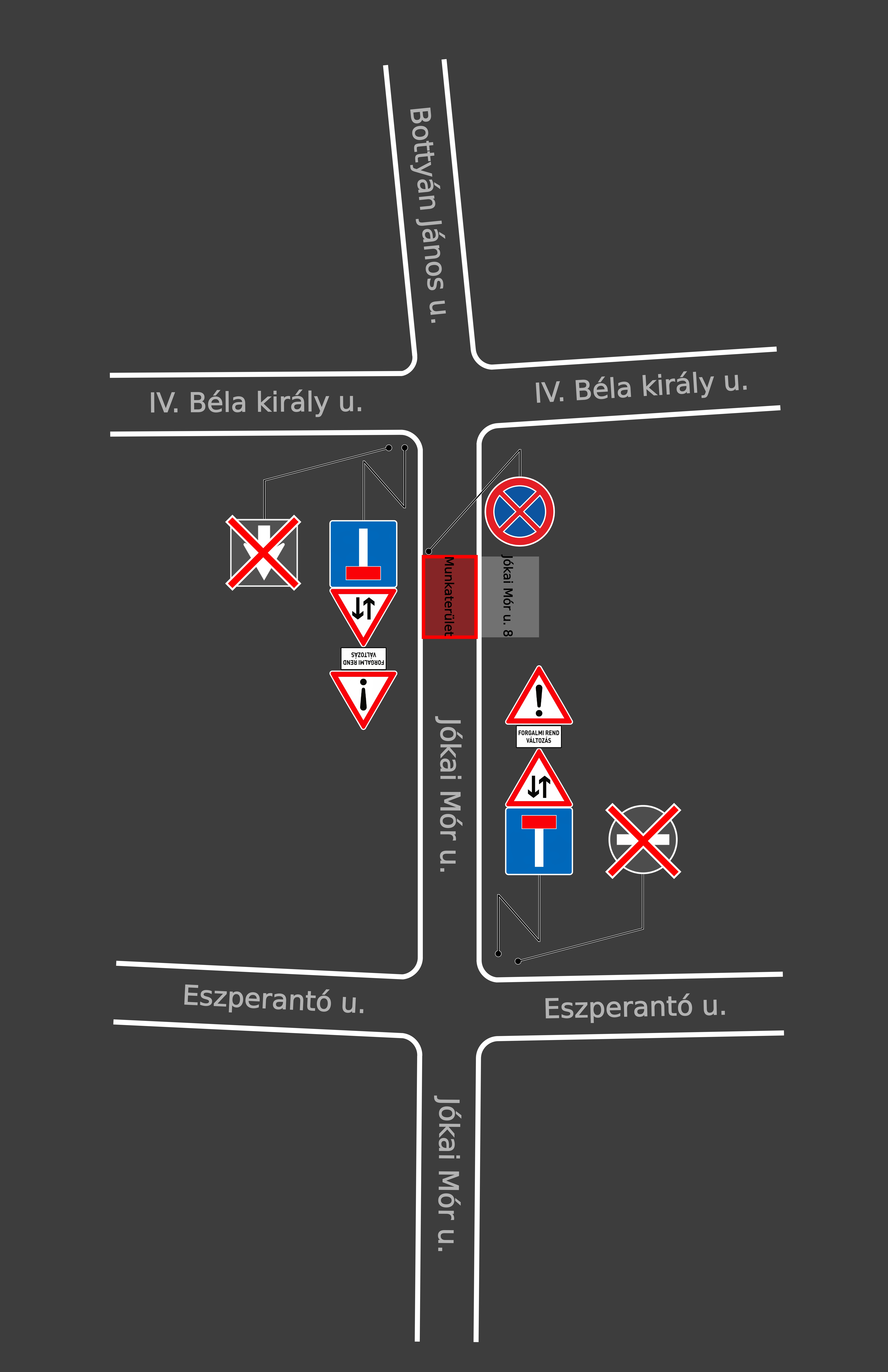 A Jókai utca – Eszperantó utca kereszteződésében a „Behajtani tilos” tábla letakarásra kerül, helyette az „Egyéb veszély”, „Forgalmirend-változás”, „Zsákutca”, „Kétirányú forgalom” táblák kerülnek kihelyezésre.