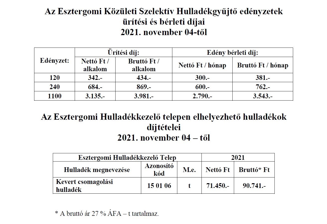 A következő díjszabás alapján vállalja a VERTIKÁL Nonprofit Zrt. a szelektív hulladékok elszállítását és fogadását.