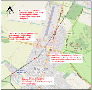 • A 2. vv. 427+00 hm. szelvényében, és Esztergom, Dobó István utca kereszteződésében lévő vasúti útátjáró FKG szabályozása                                 > teljes útzár várható  2022.10.02-án,  előreláthatóan 07:00-13:00 óra között