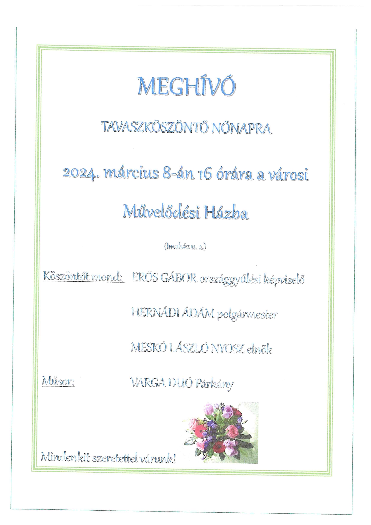 A szervezők nagy szeretettel várnak mindenkit tavaszköszöntő nőnapi rendezvényükre a Művelődés Házába!